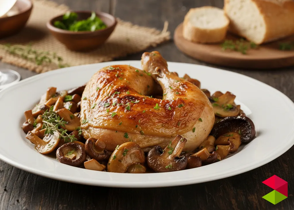 La carne del pollo de corral, más firme y sabrosa que la de un pollo convencional, se combina con el sabor intenso y aromático de las setas, creando un plato elegante y reconfortante.